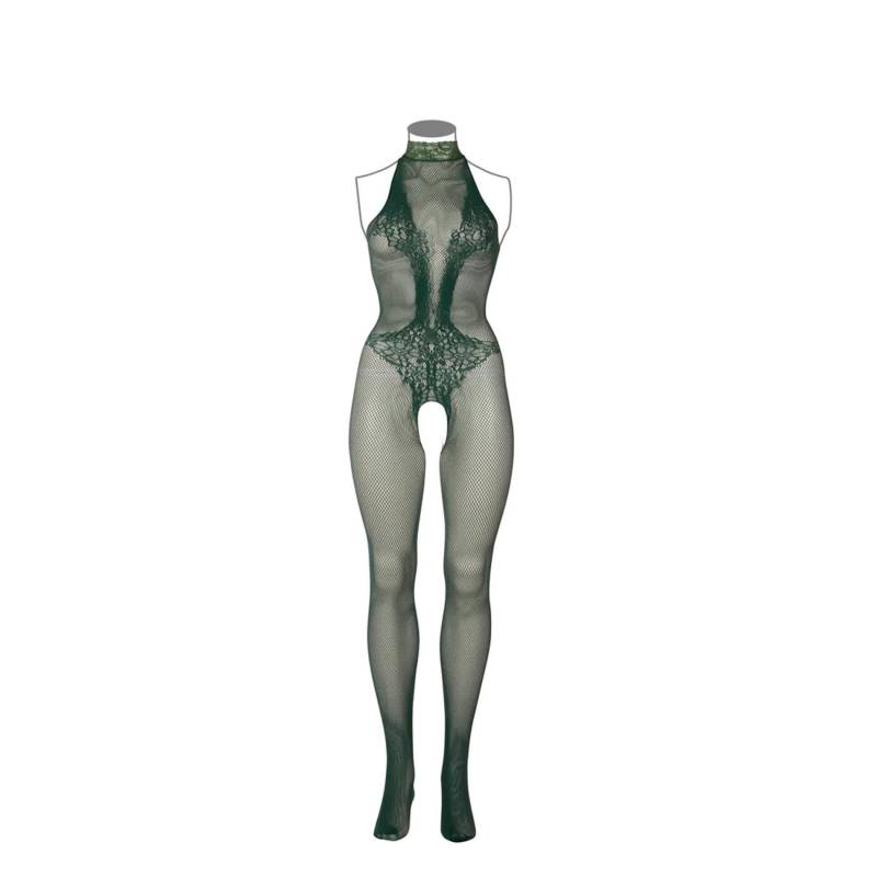 Zmysłowy bodystocking łączący koronkowy wzór z siateczką, który podkreśla kobiece kształty i dodaje całości uwodzicielskiego charakteru.