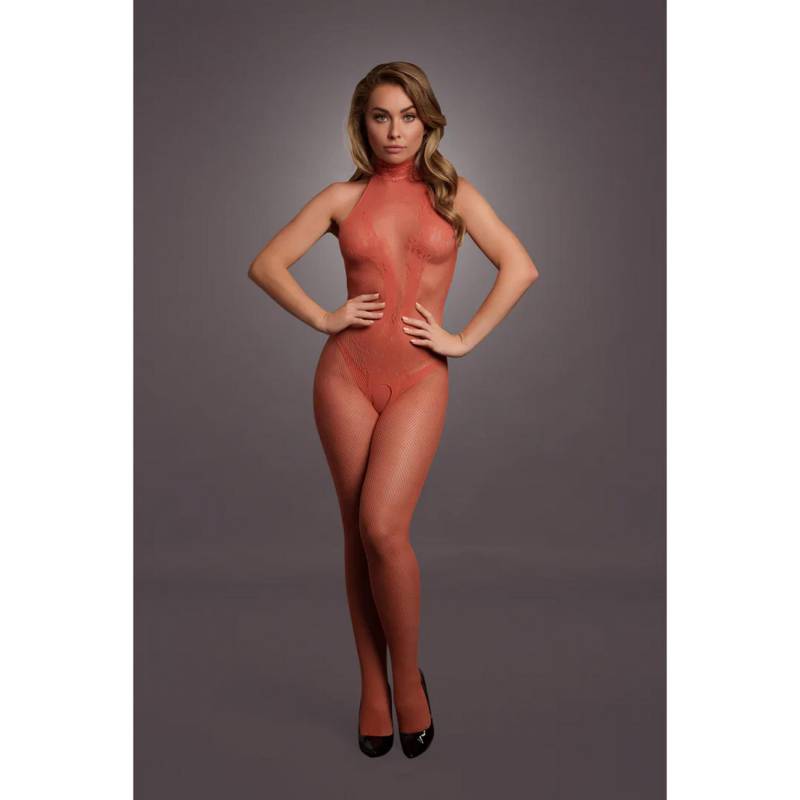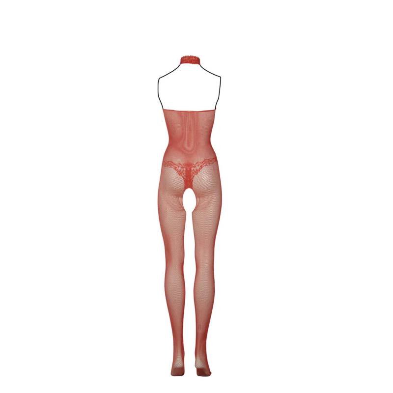 Zmysłowy bodystocking łączący koronkowy wzór z siateczką, który podkreśla kobiece kształty i dodaje całości uwodzicielskiego charakteru.