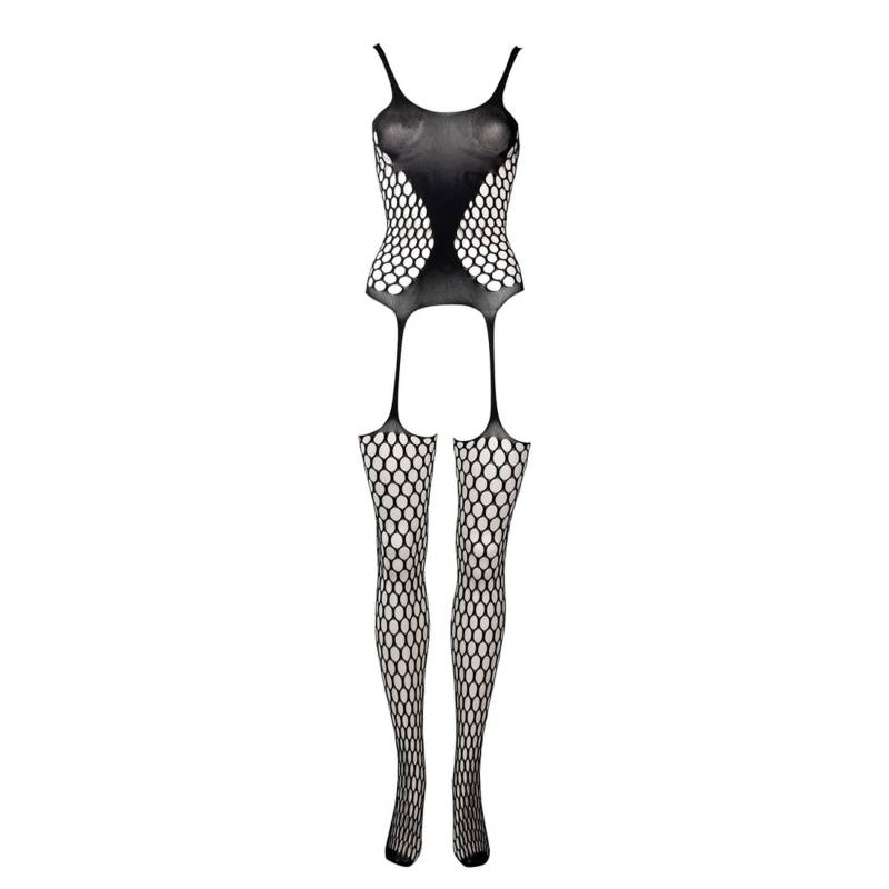Odważny bodystocking typu suspender z dużym wzorem siatki typu fence net, który zmysłowo odsłania ciało.