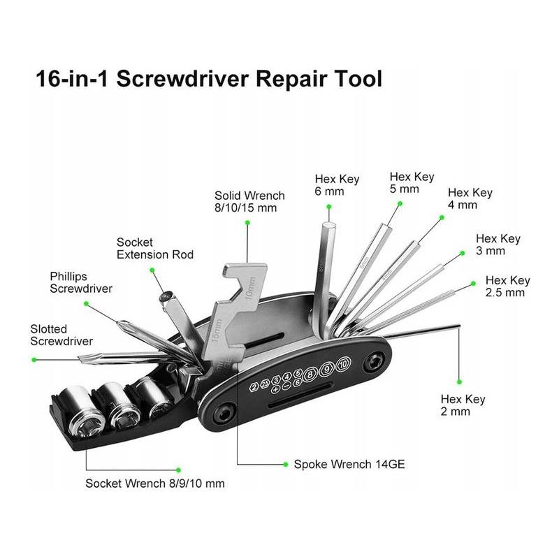 Zestaw kluczy rowerowych 16W1 Zestaw zawiera: 6 kluczy imbusowych: 2mm, 2,5mm, 3mm, 4mm, 5mm, 6 mm