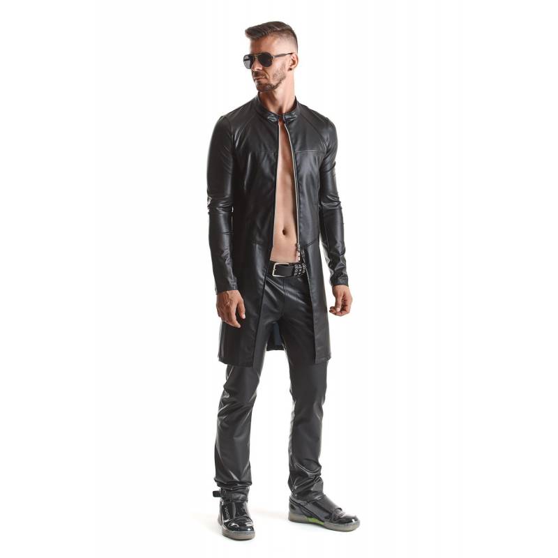 Efektowny płaszcz zdecydowanie wyróżniający się kształtem oraz licznymi rozwiązaniami konstrukcyjnymi, przygotowanymi w celu idealnego podkreślenia sylwetki i proporcji ciała. Wykonany z czarnego wysokiej klasy wetlook’a. Jest miły w dotyku i elastyczny, a w przypadku tego modelu to ważne, gdyż po zapięciu dokładnie przylega do ciała. Z przodu poziome i skośne przeszycia wyglądają same w sobie oryginalnie, ale jedocześnie wzmacniają efekt ekspozycji klatki piersiowej i linii pasa. Podobnie na plecach - w górnej części skośne przeszycia optycznie poszerzają plecy i wyglądają unikalnie. Z przodu dopasowanie produktu ułatwia srebrny ekspres. Jest także elementem ozdobnym i przyjemnym do różnego typu zabaw, gdyż można go odpinać z góry i z dołu. Czerwone przeszycia i czerwona metka z Alcantary to już cudownie dopracowane detale. Płaszcz RMMario001 doskonale nadaje się zarówno na wyrafinowane imprezy fetyszowe jak i do codziennych stylizacji.